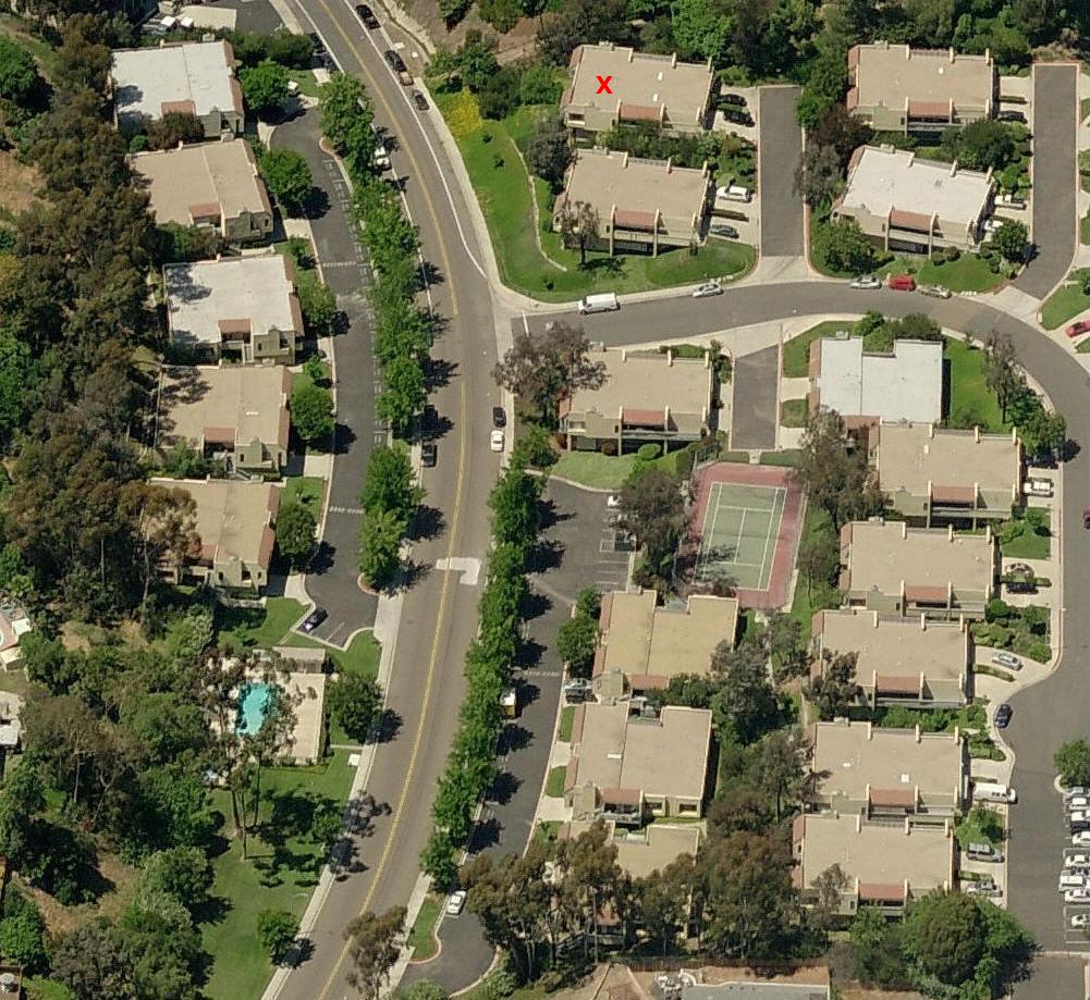 These pictures show the Montezuma Townhomes complex from the air. As you can see the area is contemporary with underground utilities (no overhead power lines) and lush with surrounding green landscaping. The "red X" marks the location of the available unit. Note the abundant parking surrounding the unit and close proximity to the tennis court and pool - only a short walk away.