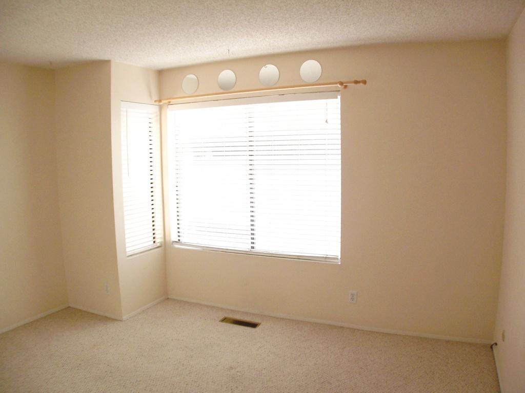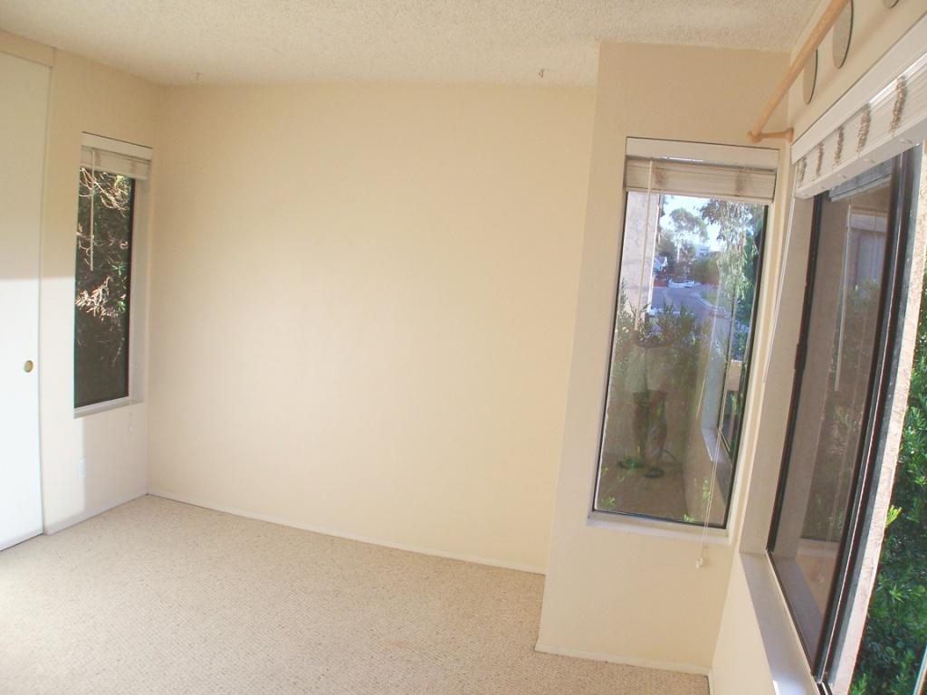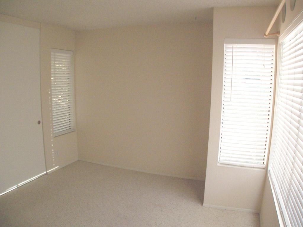 Bedroom 2 is very spacious and popular for someone that enjoys a lot of natural light. This room measures 11 feet by 13 feet and can accommodate a queen-size bed with enough space for a desk and dresser. Since this room is on the corner it is especially bright and airy with 3 windows allowing natural shaded light to enter from 3 directions (west, south and east). The room has wall to wall Berber carpet, a large double door closet with lots of hanging space and a storage shelf. The closet is 2 feet deep and 7 feet long. Faux Wood blinds are on each of the three windows. This room shares a full bathroom with the person in the adjacent Bedroom #3.