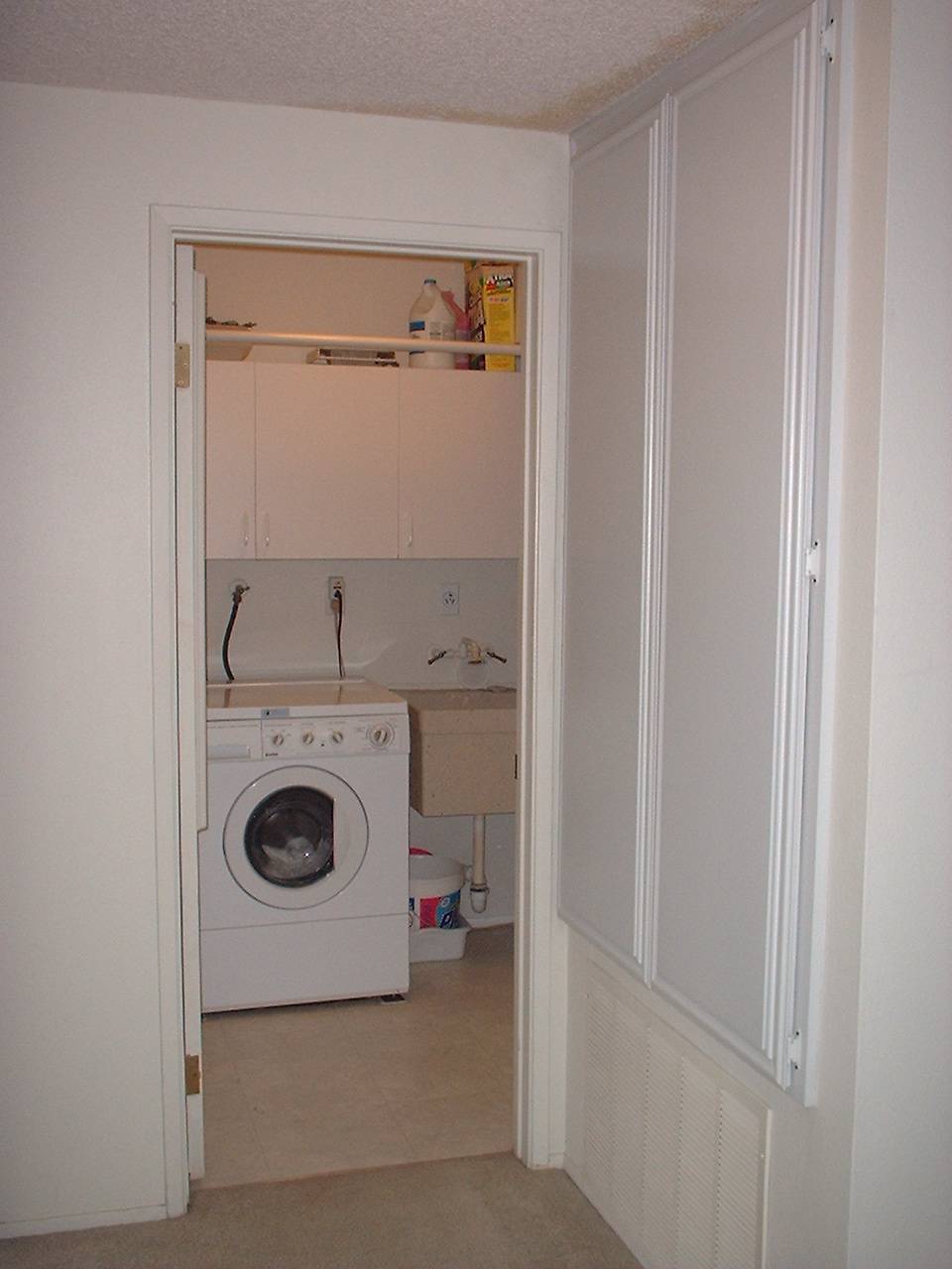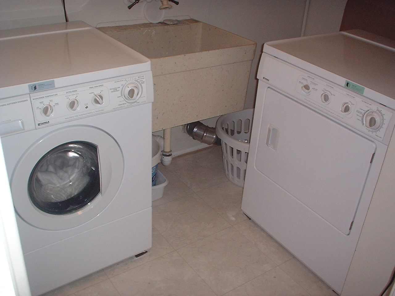 The Laundry room is conveniently located downstairs next to 3 of the 4 bedrooms. This is a much better location than in a cold, dirty garage where most laundry hook ups are located. This laundry room has been upgraded to include a wash basin, new Armstrong linoleum flooring (contemporary and easy to clean neutral marble pattern), storage cabinet, clothes bar and built in ironing board. The washer and dryer shown is included*.