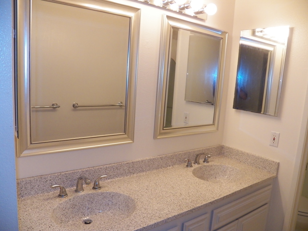 counter top, dual framed vanity mirrors, 8 bulb vanity light, 2 mirrored medicine