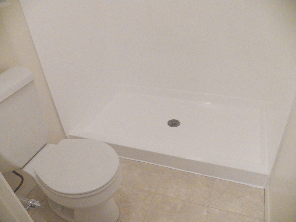private toilet and shower area. Floor has been upgraded to an easy to clean Armstrong linoleum with a contemporary neutral marble pattern (same flooring as in Laundry Room and Shared Bathroom).