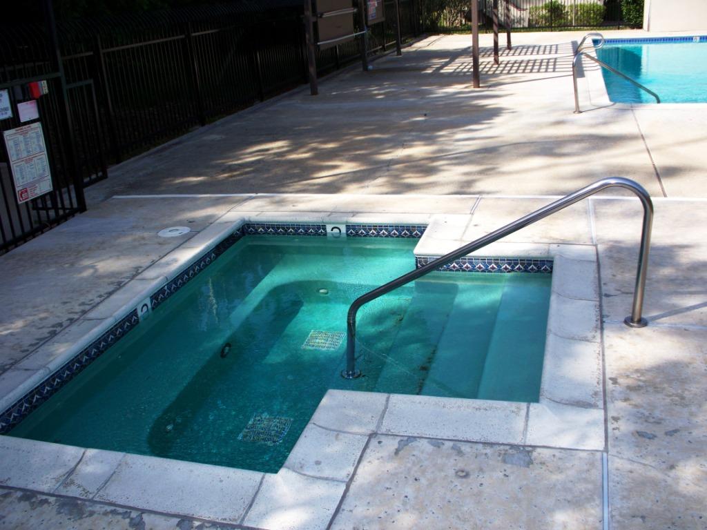 Large Fenced in Pool and Jacuzzi area features a large Pool with depths ranging from 3 feet to 8 feet and long enough for doing laps. The Pool area is surrounded by tall trees and shrubs for privacy. The Pool Area is cleaned year round and has a well maintained Bathroom and Shower for your convenience.